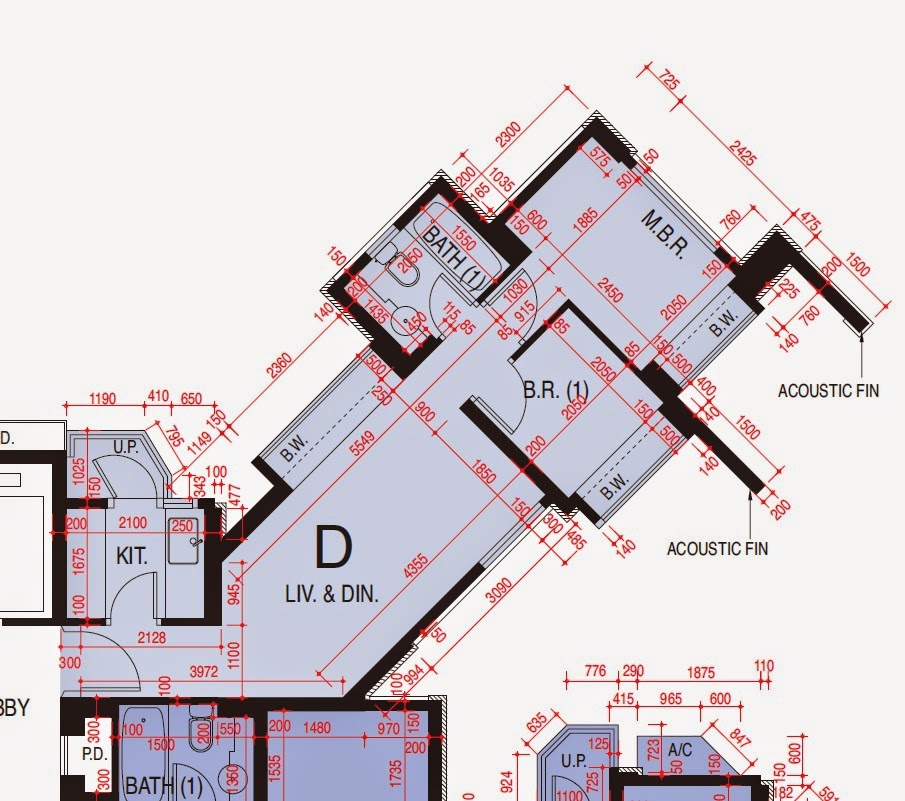 根據售樓說明書,這個單位的兩個睡房對出均建有隔聲鰭。不過,參觀人士從「清水房」示範單位根本無法了解實況,皆因示範單位並無參照售樓說明書建造隔聲鰭,只貼出標示「提醒」準買家,要很細心觀察才能發現。