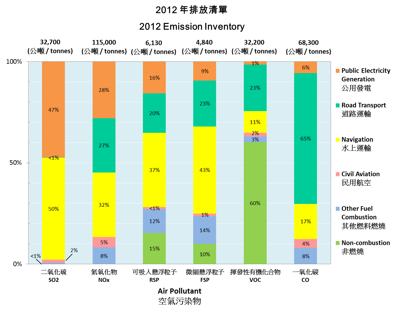 其實根據環保署公佈的,2012年香港空氣污染物排放清單,多種污染佔最大比重的其實是水上運輸,也即是來自船舶污染。例如50%二氧化硫(SO2),32%氮氧化物 (NOx),37%的 PM10和43%的PM2.5,都是來自船舶污染,而且全部的比重都是最大,位列首位的來源,大型船隻猶如無監管的「移動發電廠」。